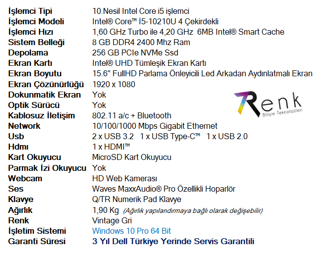 | Dell Latitude 3510 Core İ5-10210U 8GB Ram 256Gb Ssd İntel Vga 15.6" FullHD Windows10 Pro Notebook | ||||||||||||||||||||||||||||||||||