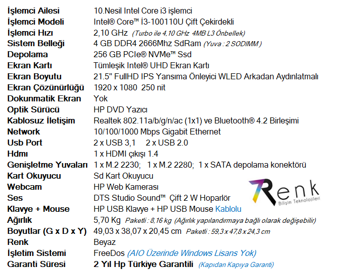 | HP 200 G4 Core i3-10110U 4GB Ram 256Gb Ssd İntel Vga 21.5" FullHD IPS All İn One Pc | ||||||||||||||||||||||||||||