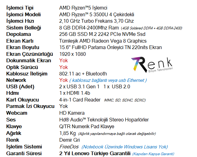 Lenovo V15 AMD Ryzen5 3500U 8Gb 256 Ssd 15.6" Notebook 82C7001HTX