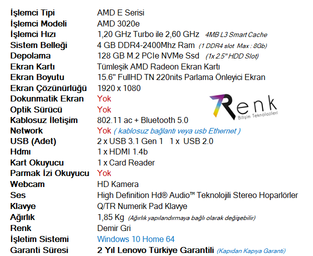 | Lenovo V15 AMD 3020e 4Gb Ram 128Gb Ssd Amd Radeon™ Vga 15.6" FullHD Windows 10 Notebook | |||||||||||||||||||||||||||||