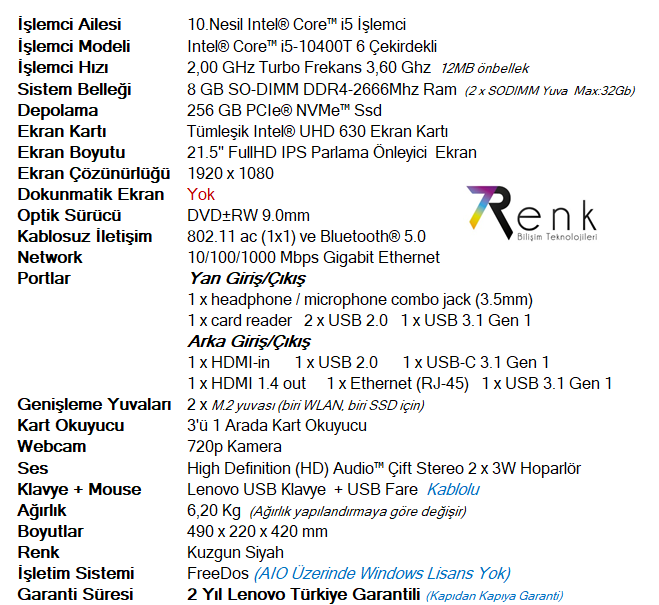 | Lenovo V50a AIO (22 "), son derece üretken bir kule masaüstü bilgisayardır. 10. Nesil Intel® Core ™ işlemcilere |